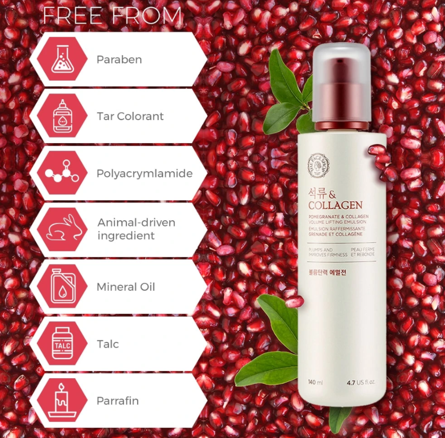 • An anti-aging skin care that increases the skin's resilience through the interaction of pomegranate estrogen and marine collagen. Formulated with pomegranate extract and collagen, The Face Shop Pomegranate And Collagen Volume Lifting Emulsion is a highly concentrated firming emulsion delivers intense moisture and leaves skin feeling firm.
