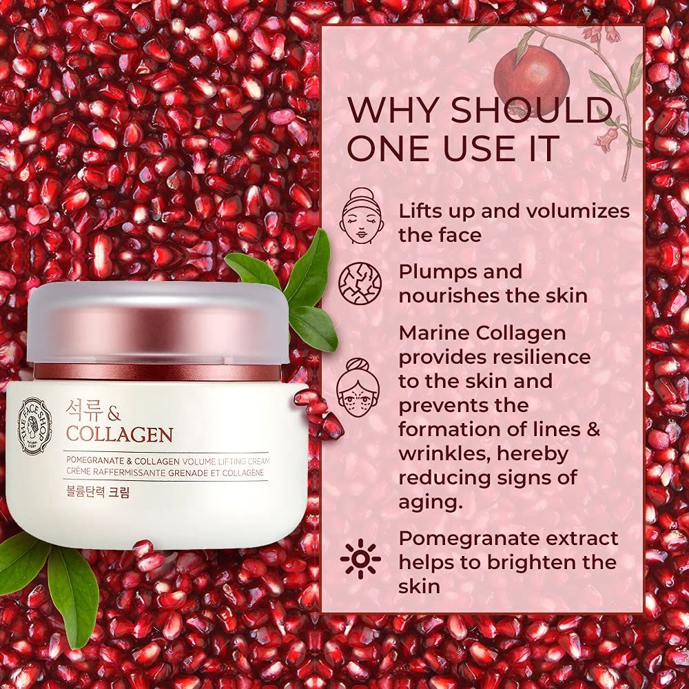 The Face Shop Pomegranate & Collagen Volume Lifting Cream is a skin firming cream containing pomegranate extract and collagen that infuses and plumps dry, sagging skin with moisture while providing glow and nourishment. The uplifting and anti-wrinkle properties of this product moisturizes your skin while keeping firm and beautiful.